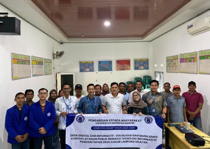 Lampung Selatan – Dosen dan Mahasiswa Universitas Indonesia Mandiri melakukan kegiatan pengabdian masyarakat di Pemerintahan Desa di Desa Kunjir, Kecamatan Rajabasa, Kabupaten Lampung Selatan. Selasa, (17/6/2025). Kegiatan pengabdian masyarakat ini berjudul “Desa Digital dan Informatif : Visualisasi dan Manajemen Konten…